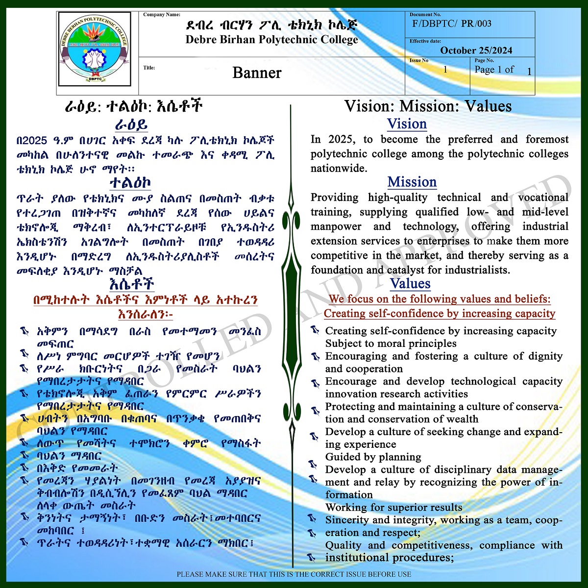 Welcome to Debre Birhan Polytechnic College, where we are committed to shaping the next generation of skilled technicians and engineers who will drive Ethiopia's technological advancement and economic growth.